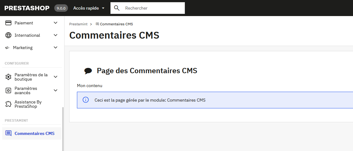 Dans ce tutoriel, nous allons voir comment créer pas à pas un onglet de menu nommé “Commentaires CMS” sous une catégorie principale “Prestamint”, avec une icône “comment” (Material Icon), et une page simple affichant le texte “Mon contenu”.